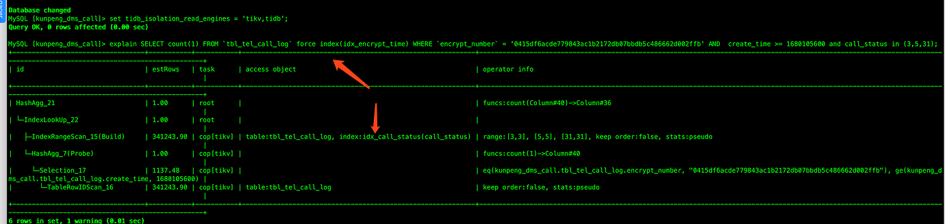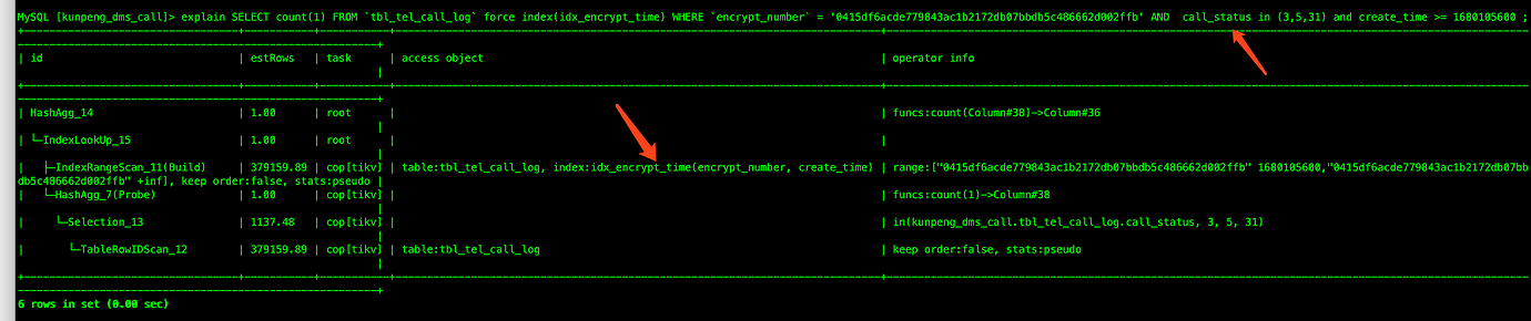 idx_encrypt_time (encrypt_number,create_time)Question 1: This SQL has been running for a long time. Why did the execution plan suddenly change to use the call_status index?