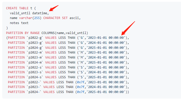 PARTITION BY RANGE COLUMNS(PARTITION_NO,CREATE_TIME)