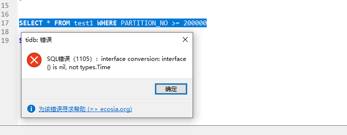 Original topic: 临界分区查询报错,sql错误1105,interface conversion: interface{} is nil ,not types.Time