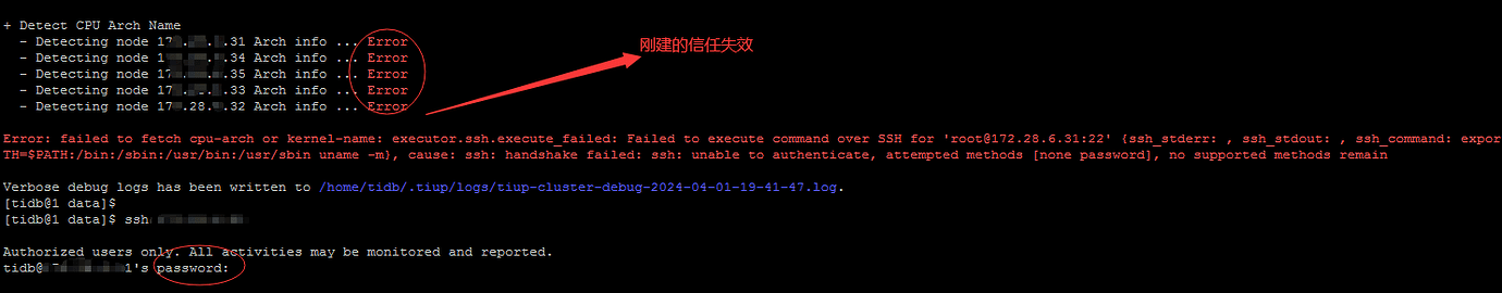 - Re-established the trust relationship of the hosts, and re-ran the trust-related steps script for tiup