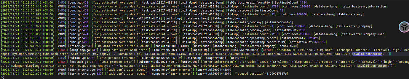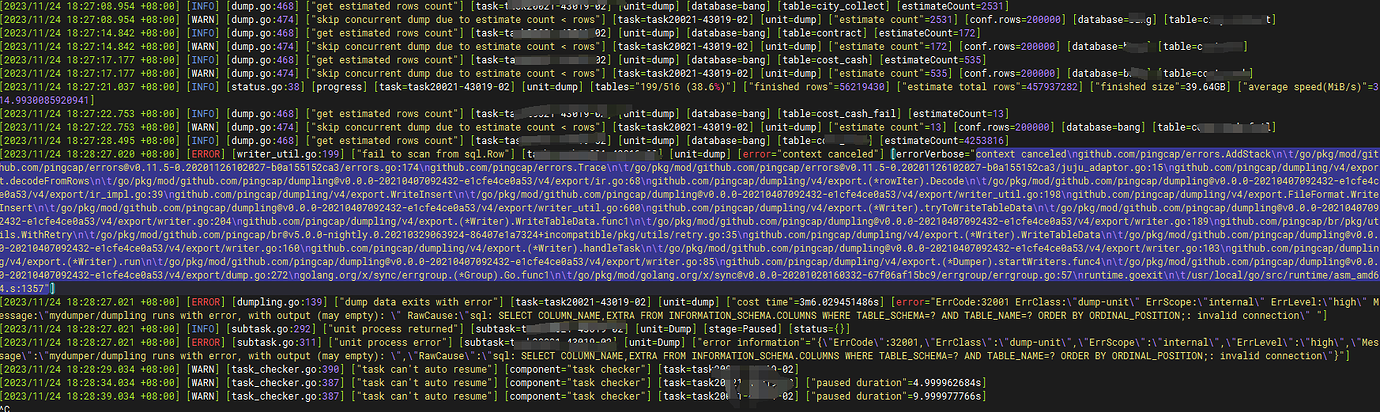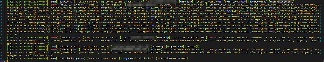 “Message”: "mydumper/dumpling runs with error, with output (may empty): ",