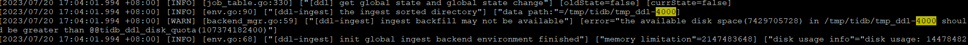 The /tmp directory is too small, set global tidb_ddl_disk_quota to a value smaller than the tmp space…
