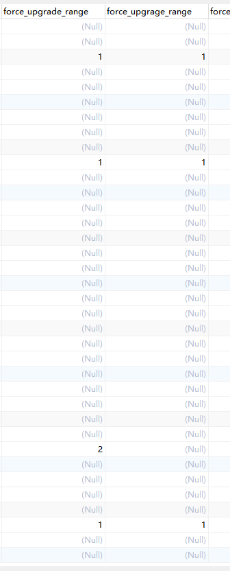 force_upgrade_range tinyint(1) DEFAULT NULL COMMENT ‘force upgrade range 1: minimum version 2: specified version’,